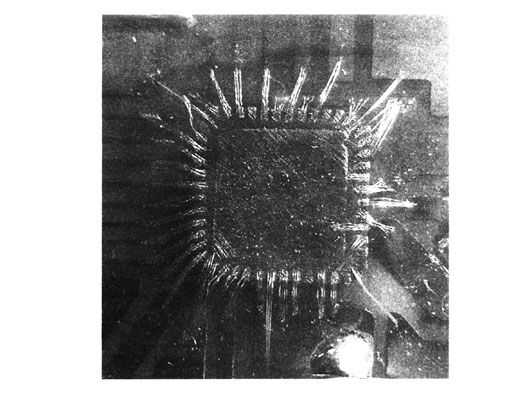 由于CC2420的封装为QLP(48pin),IC大小为6 mm×6 mm,管脚与管脚之间的距离仅0.5 mm,从而导致焊接困难,而研究室的研究方向为IC设计,所以正好有设备可以将线打到CC2420上。
